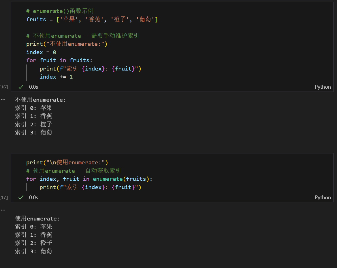 在遍历列表时,我们经常需要同时获取元素的索引和值。enumerate()函数可以优雅地实现这个需求。