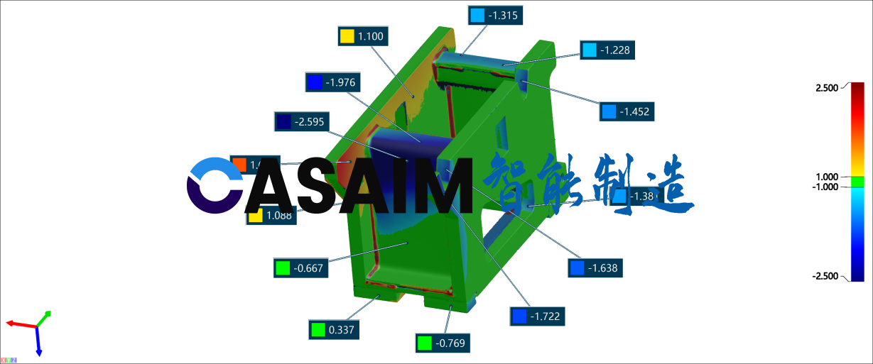中科院广州电子科教与智能制造部CASAIM三维扫描检测仪配合CASAIM智能检测软件系统对工程机械焊接件焊接前后产品进行三维扫描检测分析,高效完成工程机械焊接件外观质量控制,实现三维扫描检测结果可视化、焊缝三维横截面分析、焊接结构件变形量分析,并出具直观的检测数据分析报告。