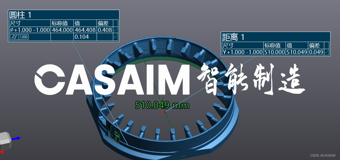 将扫描后的数据导入到软件当中,根据尺寸检测需求选取需要测量的位置,选中指令即可获得相应的数据,如图:
