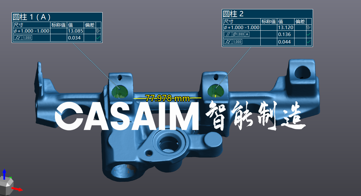 通过CASAIM三维扫描数据可以检测汽车零部件细节特征,快速获取零部件的几何数据,并与CAD模型进行比对,检测零部件形位公差,对零部件的尺寸偏差进行整体把控,并快速地判断产品是否合格,为产品质量控制提供可靠的理论依据。
