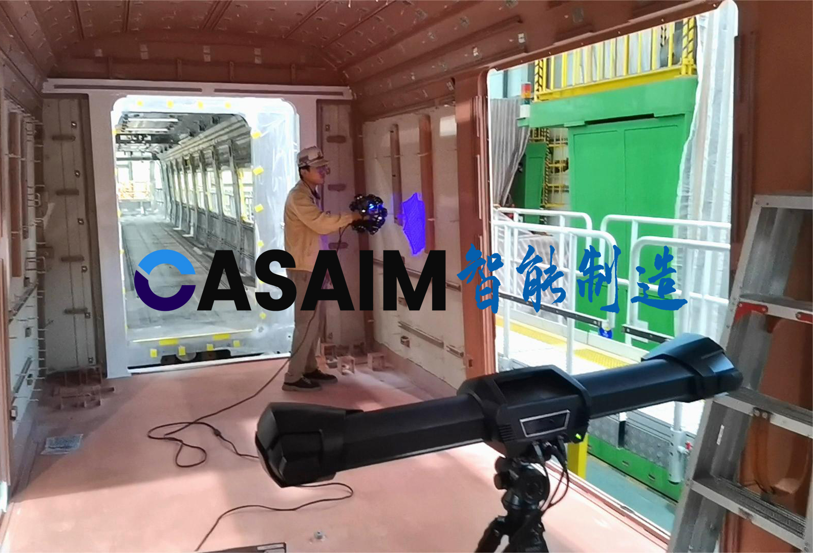 CASAIM便携式三坐标测量仪,在无需扫描的情况下,通过光笔测头与被测物体接触,从而直接测量物体表面尺寸数据,如长度、直径、角度等等,并且可以直接进行形位公差测量,精确测量轨道交通车体各个部位的尺寸和几何参数,确保车体组件的精确装配。