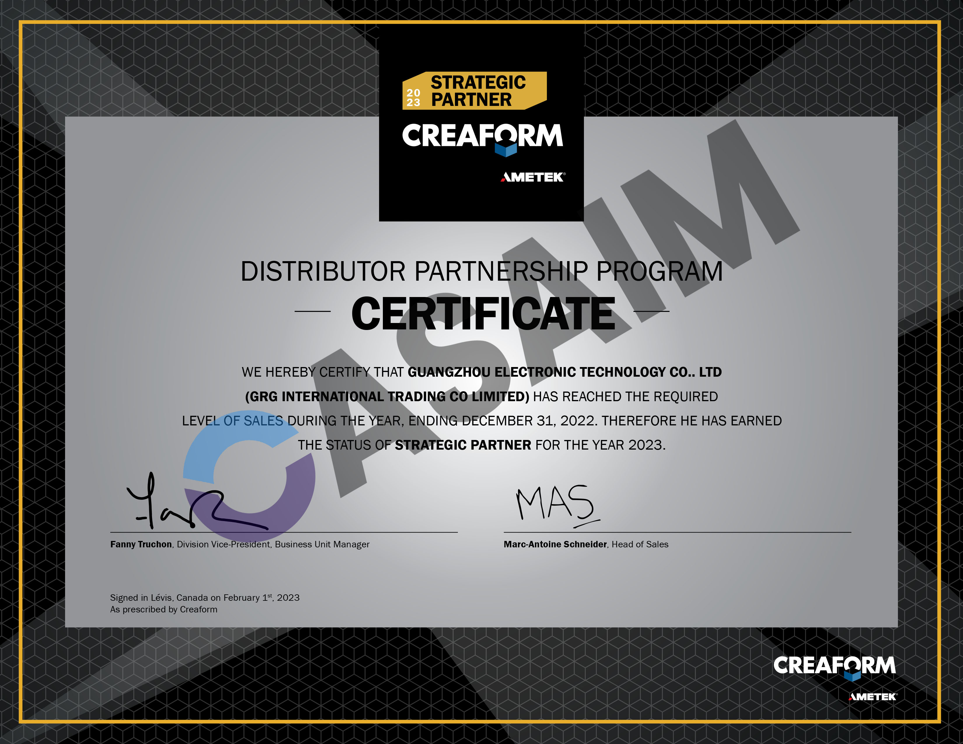 CASAIM中科院广州电子智能制造事业部连续多年荣获形创Creaform战略级代理商证书。战略级代理商是形创Creaform最高级别的合作伙伴。