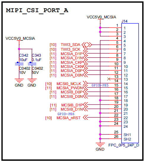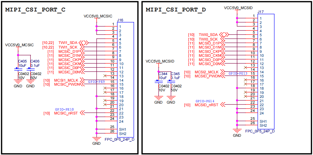 如下为 T527板卡 的 MIPI-CSI 接口原理图,使用 4Lane+2Lane+2Lane 的配置,支持3个摄像头: