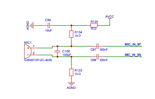 板载咪头使用差分信号 MICIN3P/3N 输入: