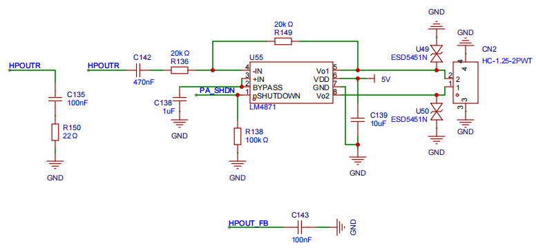 板载扬声器接口使用单端信号 HPOUTR 输出: