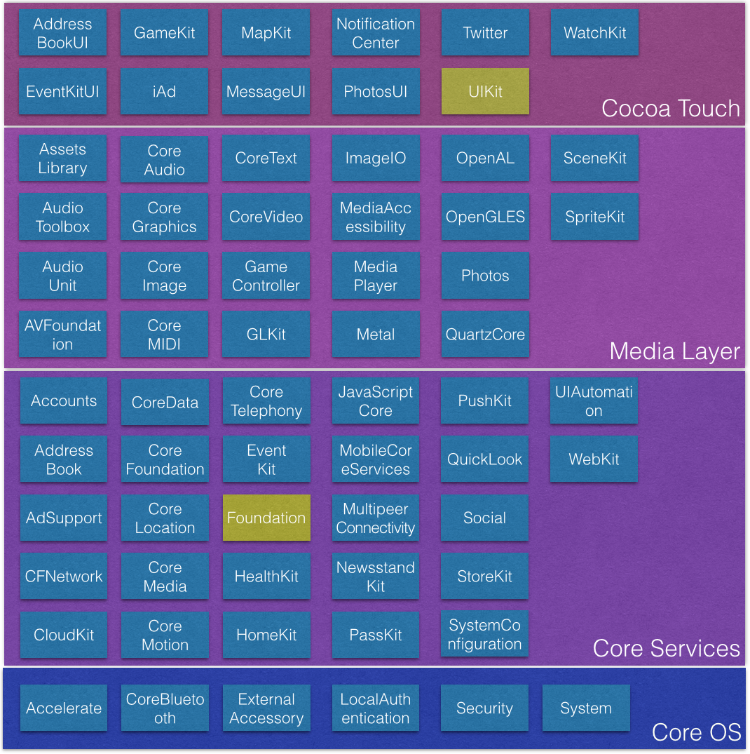 触摸层主要提供用户交互相关的服务,比如界面控件、事件处理、通知中心、地图,包含以下框架: