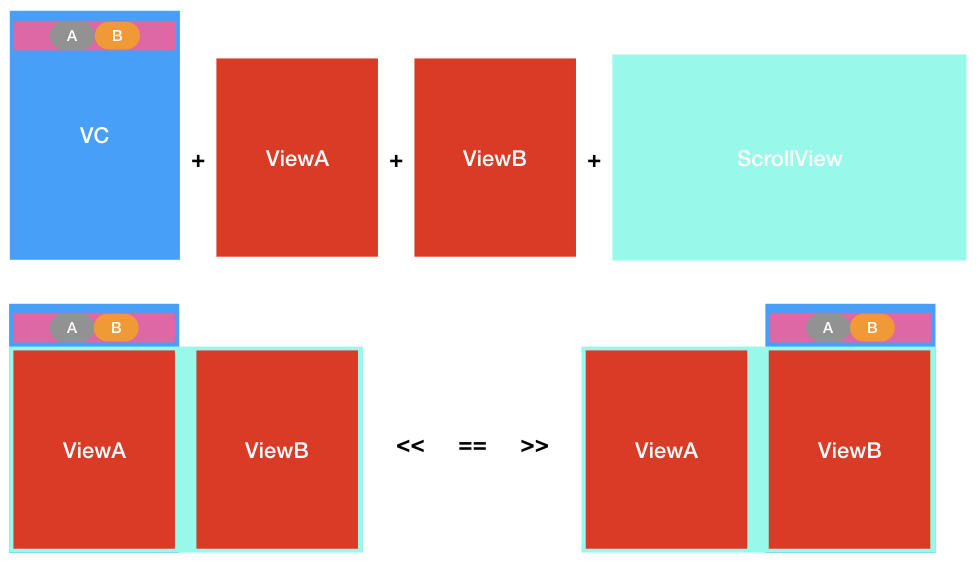第一种方式:如上图所示,实现的思路就是使用UIScrollView控件,将ViewA和ViewB都放置在UIScrollView中,然后当点击UISegmentedControl控件时,使用UIScrollView对象的内容偏移的方式,达到所需效果。