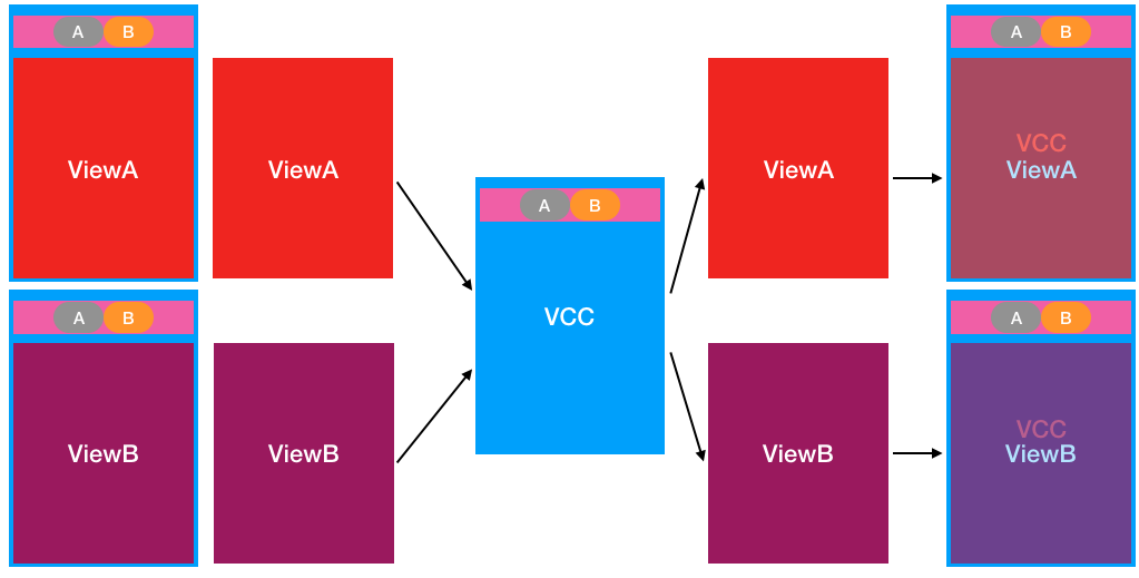 第三种实现方式:如上图所示,VCC专门作为一个控制器容器,轮流着将ViewA和ViewB添加到ViewC上面。