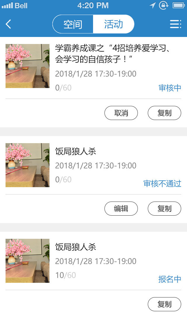 结合这张图,我先讲解下产品的要求。导航栏上面放置一个UISegmentedControl控件,可以切换“空间”数据、“活动”数据。并且空间数据的展示界面和活动数据的展示界面是不一样的UI布局。