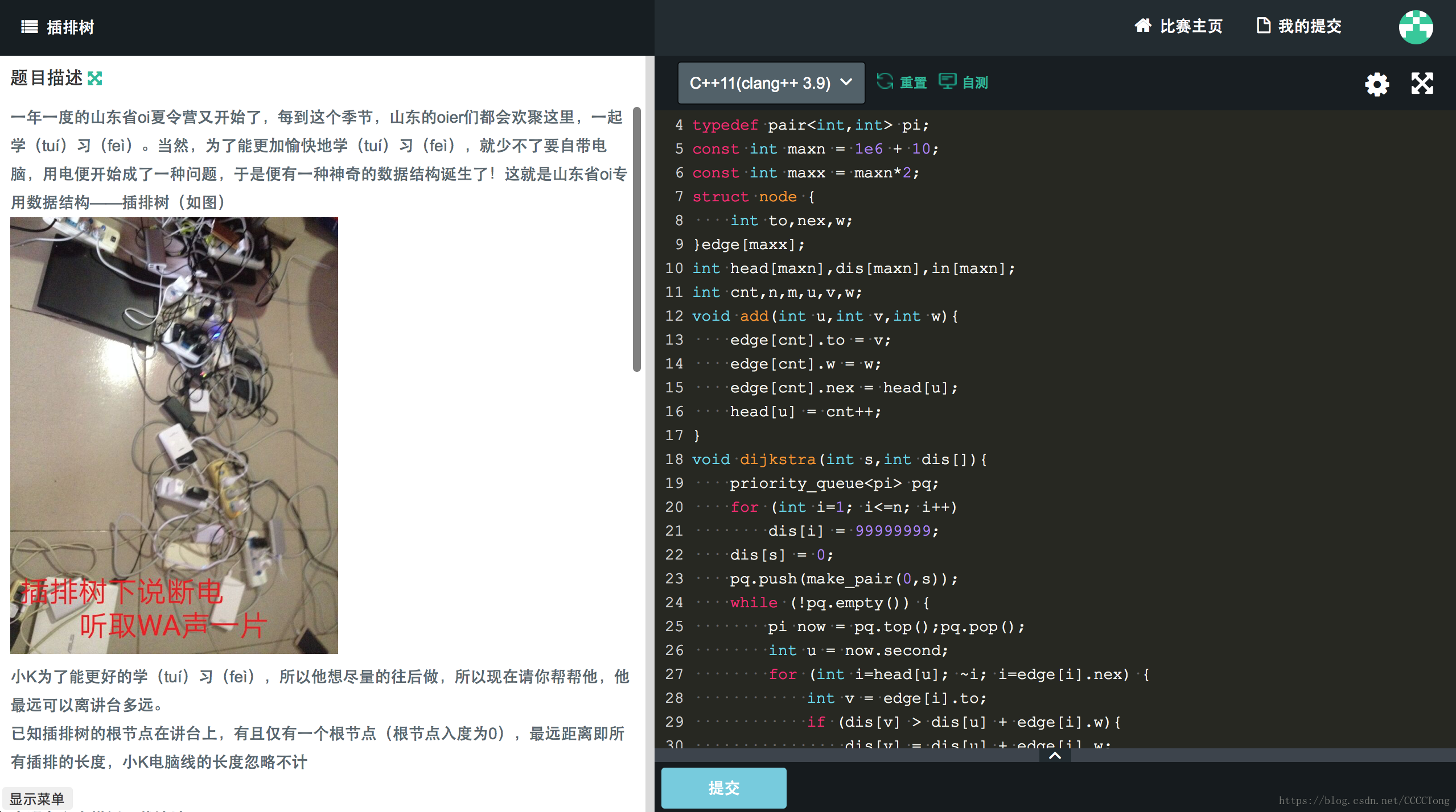 名字挺有意思的,排插树,虽然这是个图。算dijkstra的模版题,求最短路里面最长的那条,因为到讲台的距离总是取决于最短的那条路,但是又要求离讲台最远,那么我们通过dijkstra计算出起始点到所有点的最短路然后遍历找最大值就好。