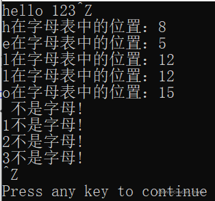 编写函数,从标准输入中读取字符,直到遇到EOF。程序要输出每个字符是否是字母。如果是,还要求输出该字母在字母表中的数值位置。例如: