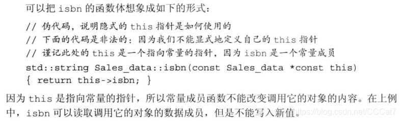 如果isbn是一个普通函数而且this是一个普通的指针参数,我们应该把this声明成const Sales_data *const。然而this不会出现在参数列表中,所以C++规定把const关键字放在参数列表后面表示this是一个指向常量的指针,这样的函数成为常量成员函数