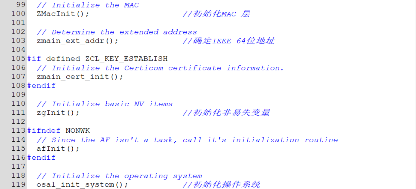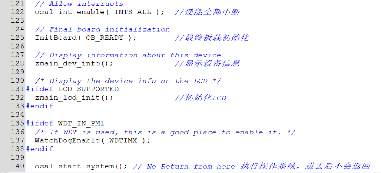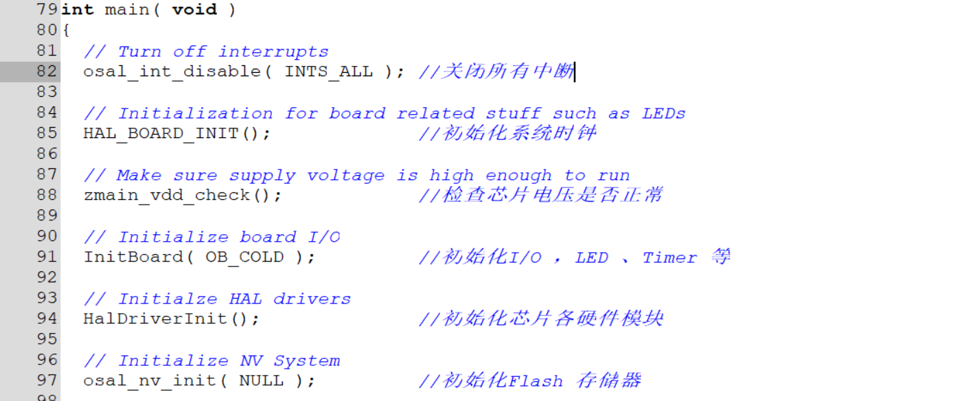 OSAL(Operating System Abstraction Layer)是ZStack的任务调度核心,采用事件驱动机制。关键初始化流程在 ZMain.c中实现,下图均为必要的初始化函数,它们最终的运行结果是启动OSAL系统
