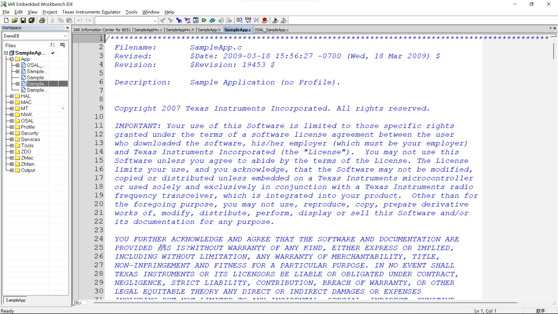 打开SampleApp工程(路径:Projects/zstack/SampleApp/CC2530DB)