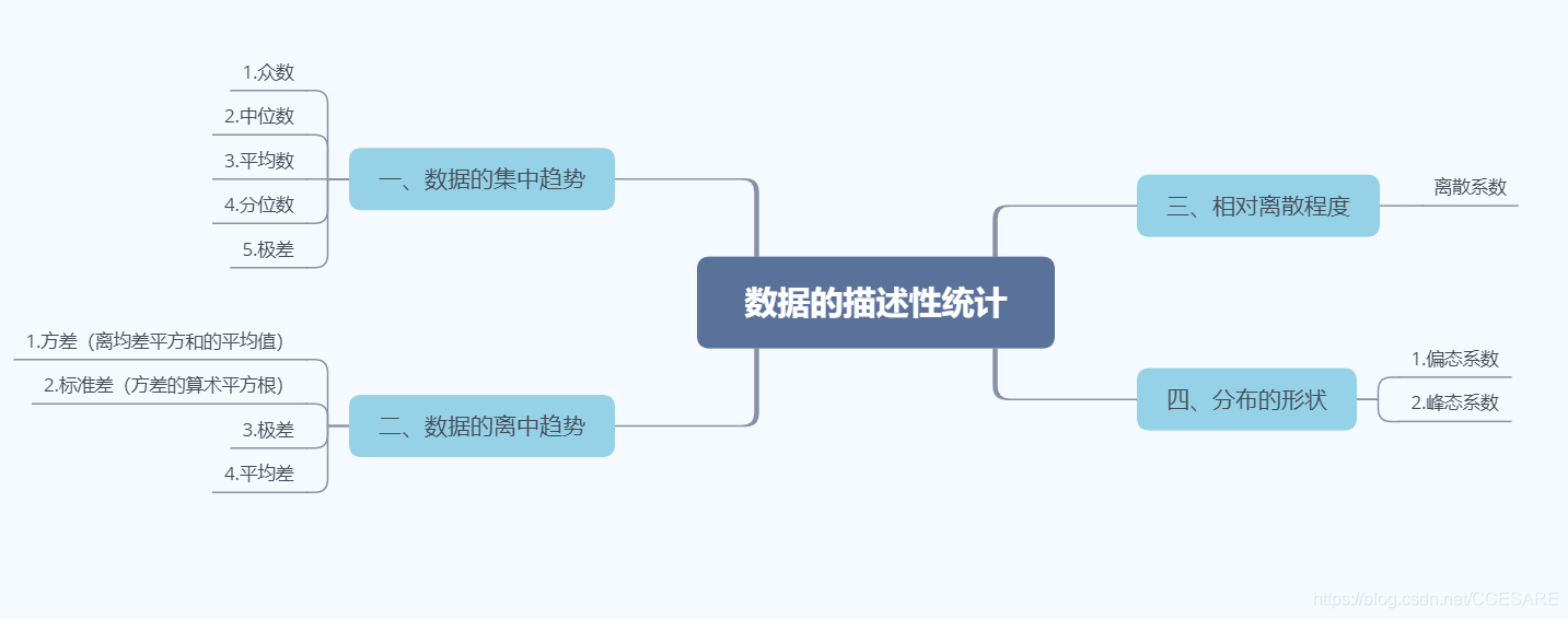 本文介绍了数据的描述性统计,包括数据的集中趋势(众数、中位数、平均数和分位数),离中趋势(方差、标准差、极差和四分位差),相对离散程度(离散系数)以及分布的形状(偏态系数和峰态系数)。通过这些统计量,可以更好地理解和分析数据的特性。