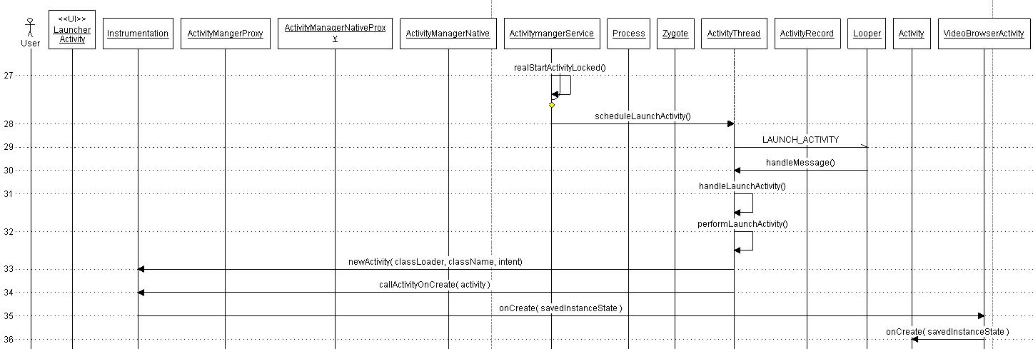 考虑从Launcher启动应用程序时,ActivityManagerService,Launcher,MainActivity之间的执行与通信序列如下图。在源码中相应的过程调用或进程通信处加入日志信息,用于分析启动时各部分的耗时。