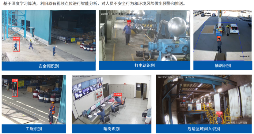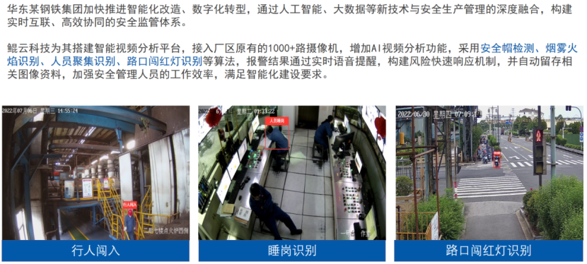 江苏某钢铁集团厂区,接入原有1000+路摄像机,通过AI视频分析,实现了安全帽检测、烟雾火焰识别等多种功能,构建了风险快速响应机制。