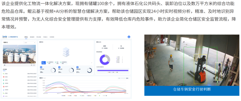 某化工仓储厂,利用AI-BOX解决方案,实现了24小时实时视频分析,精准预警异常情况,为无人化综合安全管理提供了有力支撑。