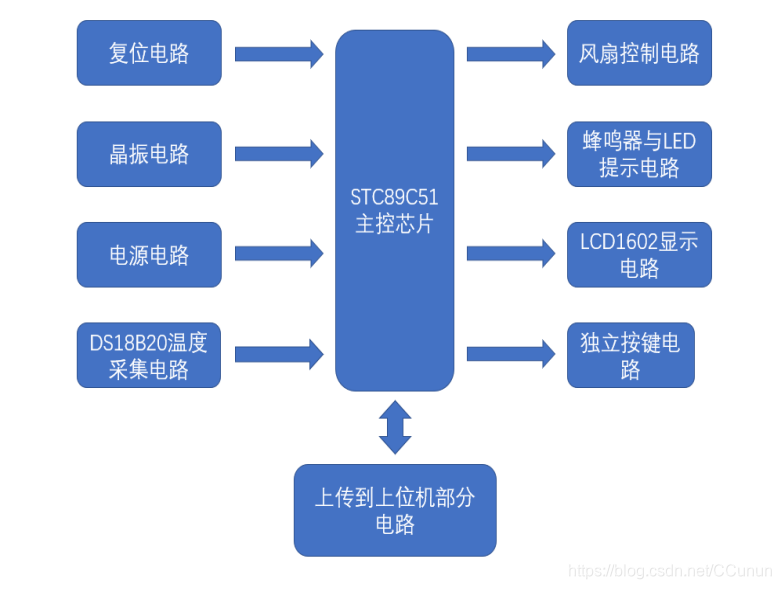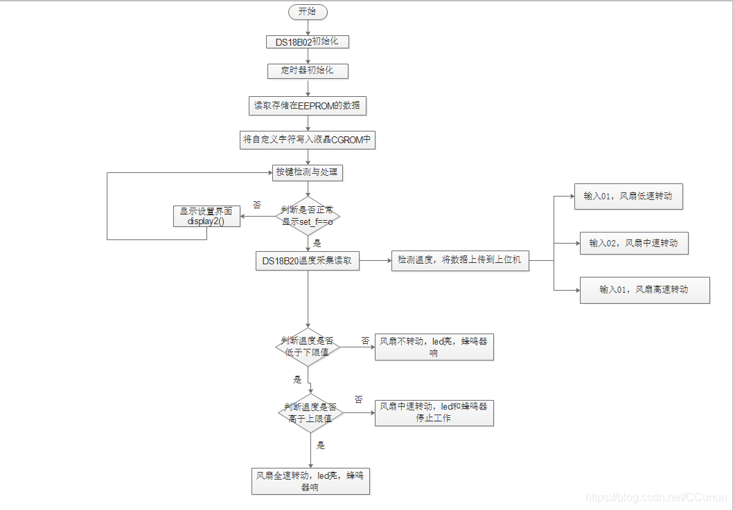 本设计采用STC89C51单片机为主控芯片,采用数字型温度传感器DS18B20检测环境温度,通过LCD1602实时显示温度值,并且能通过串口发送指令调节风扇转速。系统添加了几个按键,用户可以通过按键进行设置温度的上、下限值,并将数据保存在单片机EEPROM中做到掉电存储的功能。当所采集温度超过上限值时,蜂鸣器鸣叫、LED灯亮、风扇全速转动;当所采集温度低于下限值时,蜂鸣器鸣叫、LED灯亮、风扇停止运转;当所采集温度介于上下限温度之间时,蜂鸣器、LED灯停止工作、风扇中速运转。