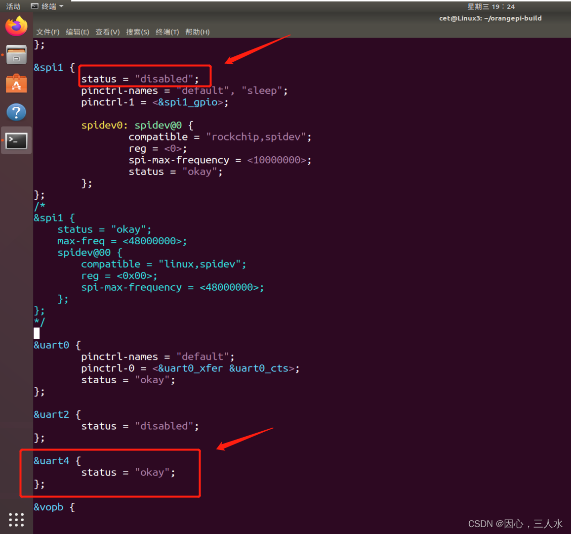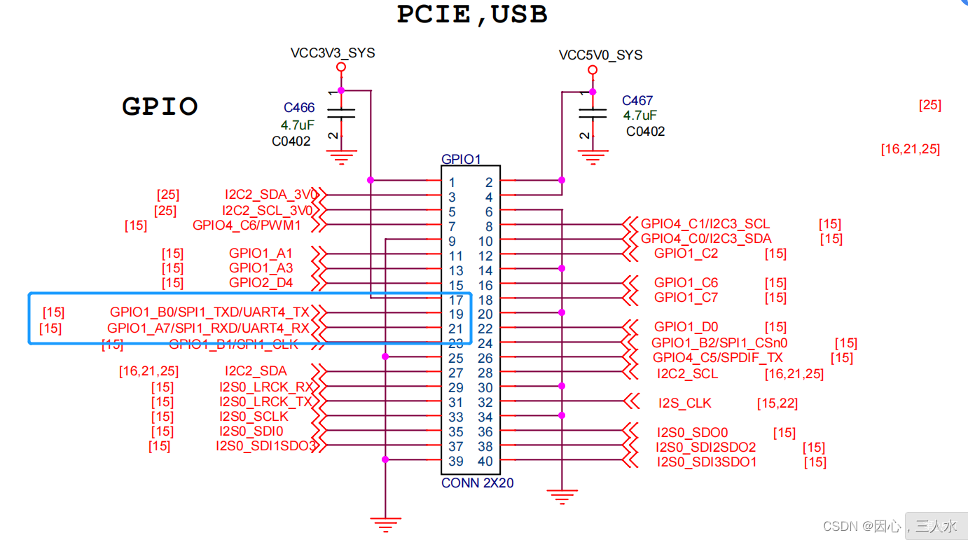 OragnePi 4B 的 SPI 和 UART4 复用相同的引脚,在 dts 中默认打开了 40pin 中的 SPI1,关闭了 UART4 控制器,如果需要使用 UART4,首先需要在内核的 dts 中打开UART4 的配置并关闭 SPI1 的配置。