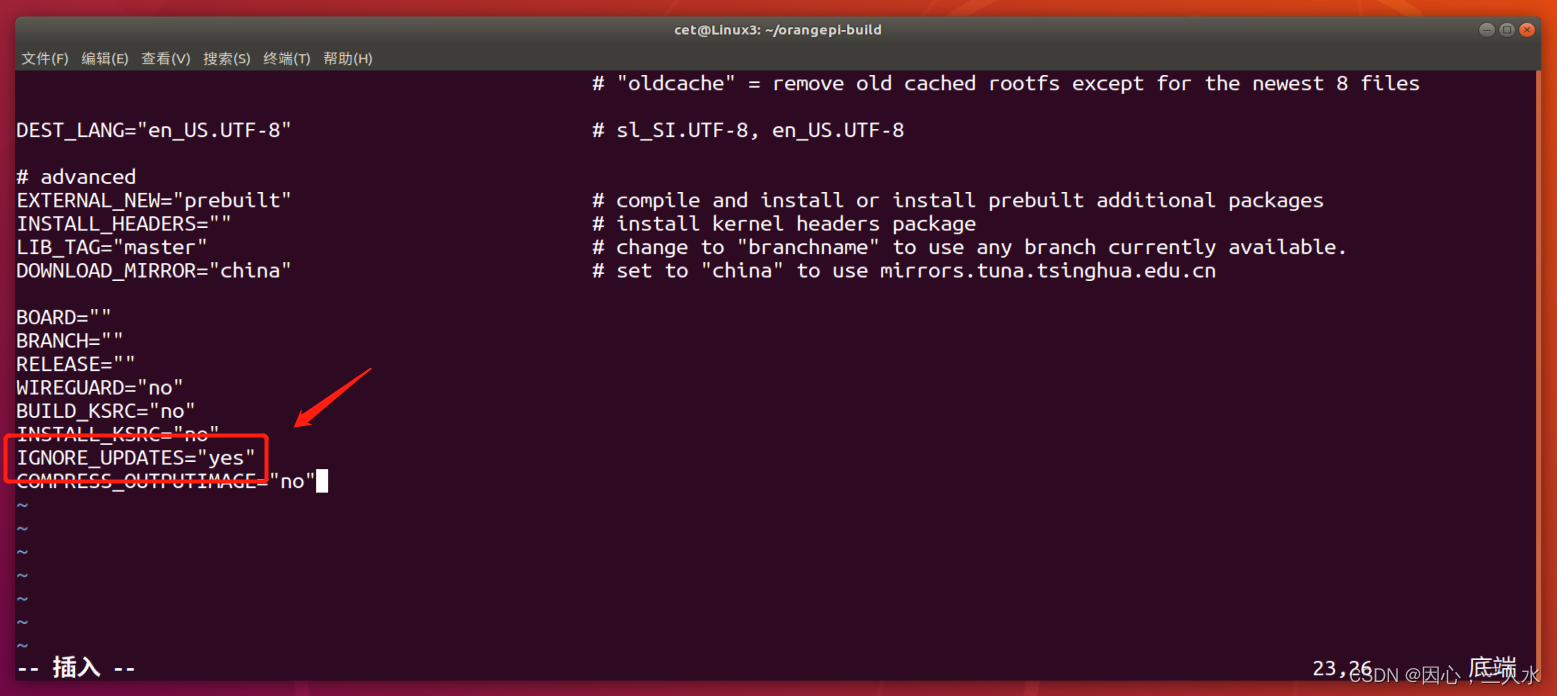 orangepi-bulid 编译系统编译 linux 内核源码时首先会将 linux 内核源码和 github 服务器的 linux 内核源码进行同步,所以如果想修改 linux 内核的源码,首先需要关闭源码的更新功能(需要完整编译过一次 linux 内核源码后才能关闭这个功能,否则会提示找不到linux 内核的源码),否则所作的修改都会被还原。