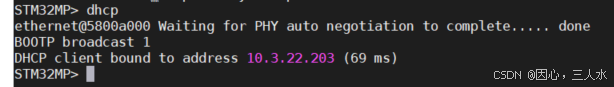自动获取IP地址,前提是开发板得连接到路由器上的,或者开发板连接到交换机,交换机再连接到路由器,如果开发板是和电脑直连的,那么 dhcp 命令就会失效