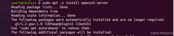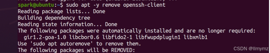2)输入下面的命令安装 openssh-server。为避免版本冲突这里先卸载 openssh-client,在安装