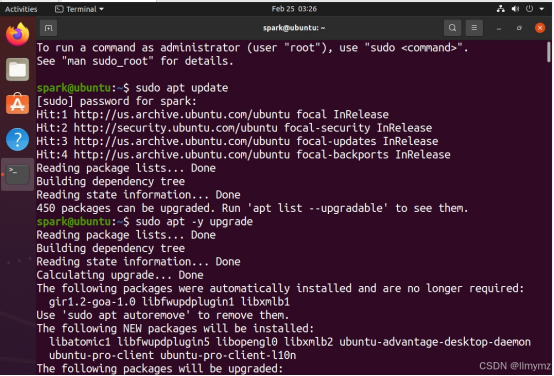 1)打开一个 Linux 终端窗体,在其中输入下面的命令,先更新一下软件源信息并对当前已安装的软件进行升级