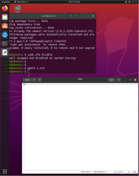 输入下面的命令,将 Ubuntu20.04 自带的防火墙禁用掉,避免在远程终端连接时出现问题,包括运行 Hadoop 和 Spark 时也要禁用防火墙