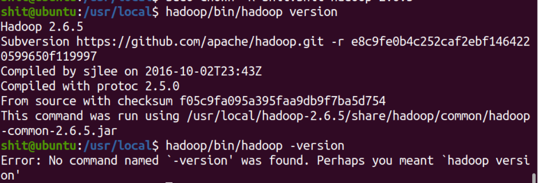 如果在version前加 - ,像java那样,就会报错。-version 被误认为是选项,但 Hadoop 并未定义该选项。