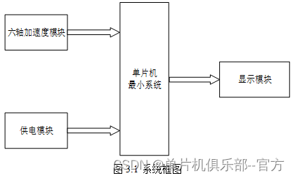 本设计以单片机为核心控制器,加上其他模块一起组成此次设计计步器的整个系统,其中包括中控部分、输入部分和输出部分。中控部分采用了单片机控制器,其主要作用是获取输入部分的数据,经过内部处理,逻辑判断,最终控制输出部分。输入由两个部分组成,第一部分是六轴加速度模块,通过该模块检测当前用户的步数;第二部分是供电模块,通过该模块可给整个系统进行供电。输出通过数码管显示当前的步数。具体系统框图如图3.1所示。