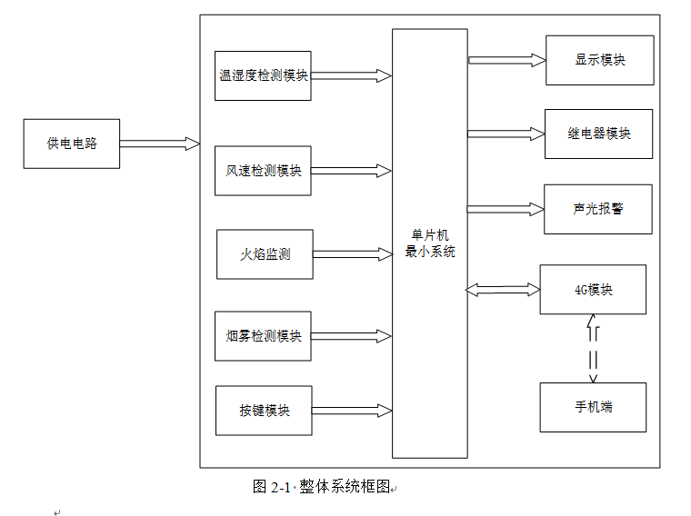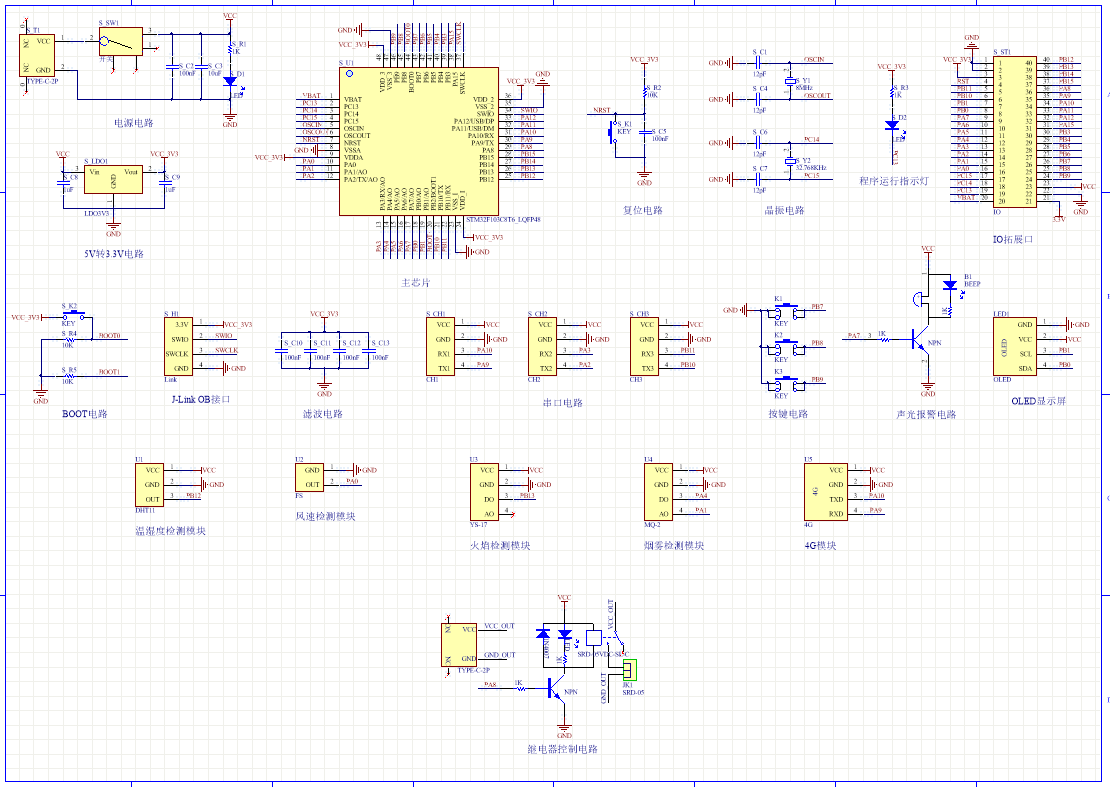 此次设计是基于STM32F103C8T6单片机的森林火灾检测系统设计设计主要可以分为三部分:输入、输出和中控。中控部分采用STM32F103C8T6单片机作为主控芯片,主要是对输入进行处理然后控制输出;