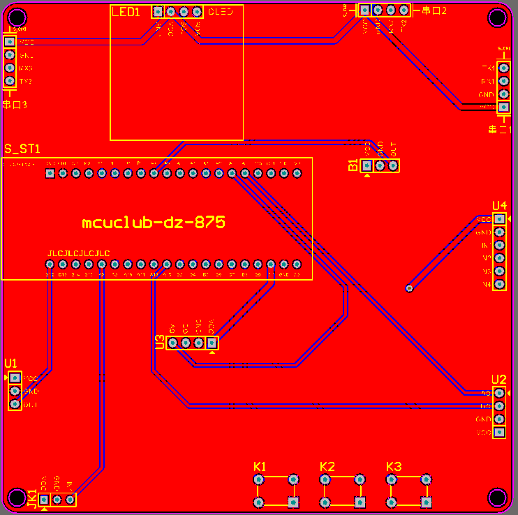 板子为绿色PCB板,两层板,厚度1.2,上下覆铜接地。元器件基本上为插针式,个别降压芯片会使用贴片式。