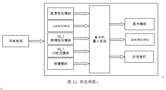 输入部分由以下模块组成:第一部分是人体检测模块,用于检测当前车内是否有人;第二部分是温度检测模块,用于检测车内温度;第三部分是MQ_3酒精检测模块,用于检测车内是否有酒精含量,第四部分是MQ_7CO检测模块,此模块用于检测车内CO含量;第五部分是语音播报模块,当异常状态下进行语音播报;第六部分是按键模块,用于设置阈值;第七部分是供电模块,为系统提供稳定的电源支持。