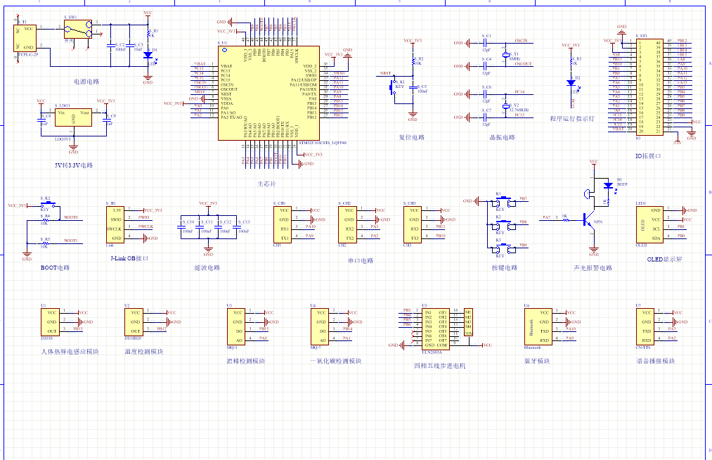 本设计以STM32F103C8T6单片机为核心控制器,构建一个基于单片机的车内环境检测系统。由三部分组成:中控、输入和输出:输出由STM32F103C8T6单片机组成;