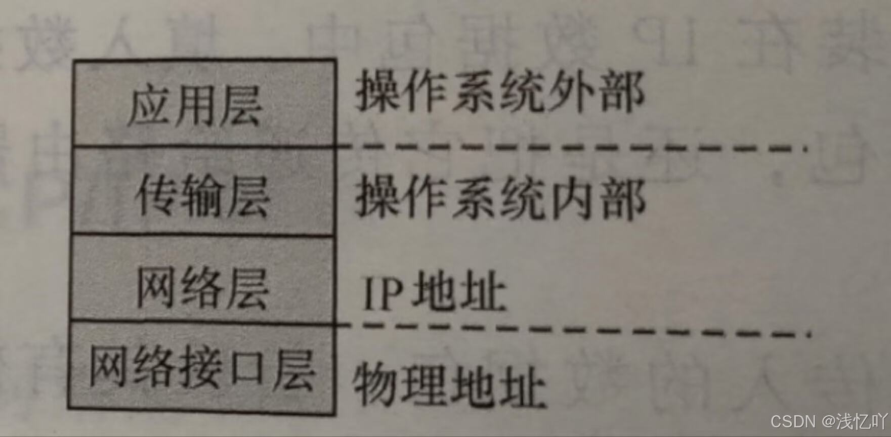 (c)网络层和其上的各层均使用IP地址,网络接口层则使用物理地址,即底层网络设备的硬件地址。TCP/IP提供在两种地址之间进行映射的功能。