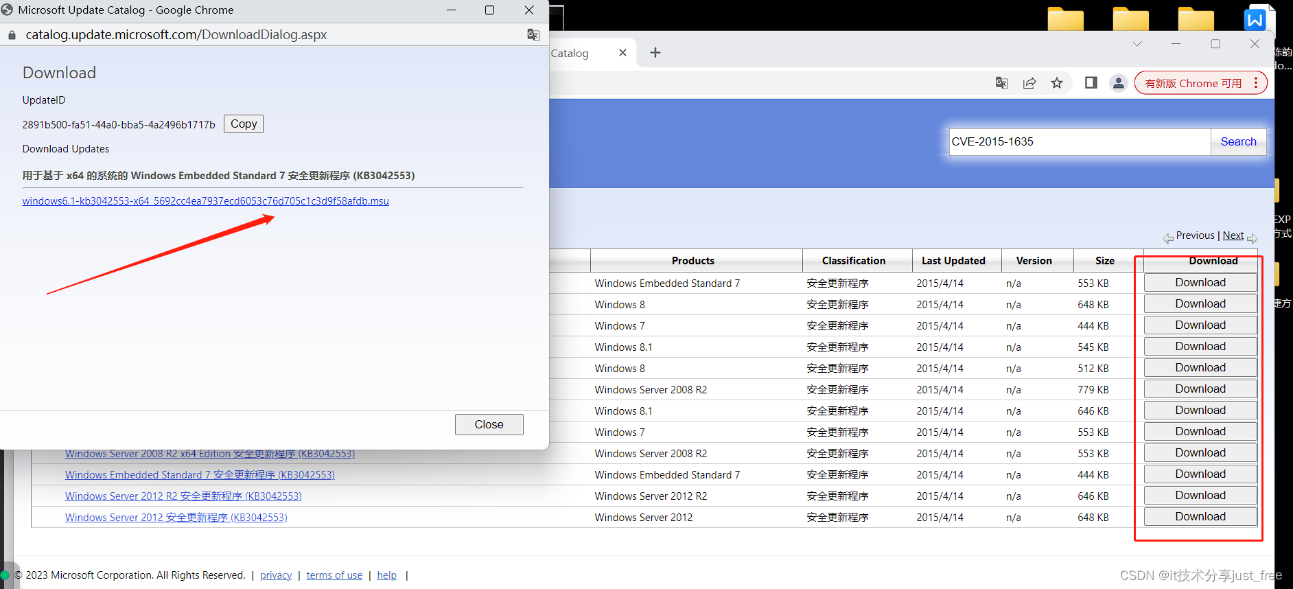 products列为补丁对应的系统版本,X86电脑或者PC服务器则 title中选择基于X64系统,点击Download,弹窗中选择下载链接即可,如下图所示:
