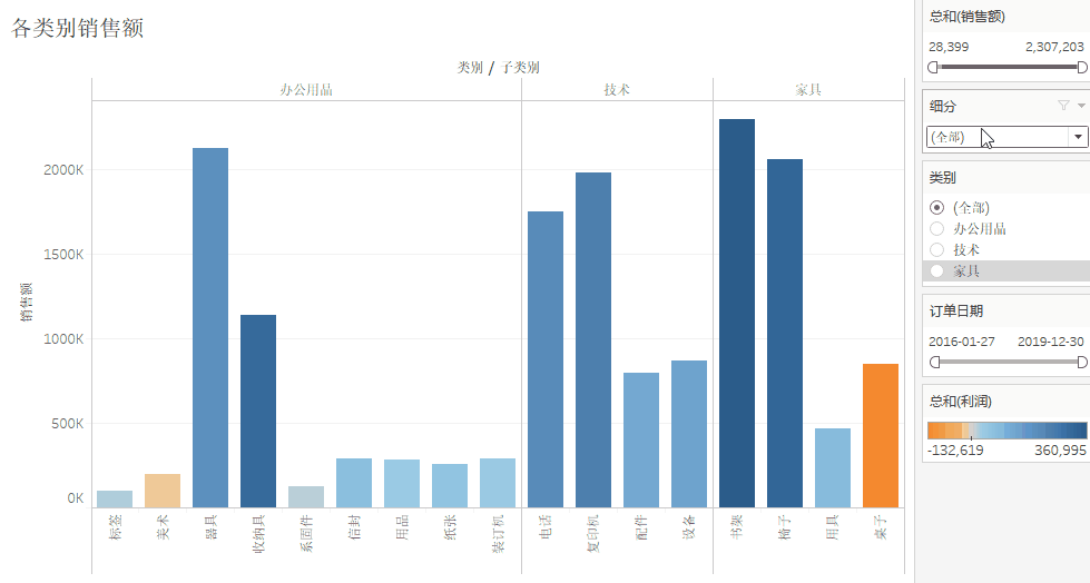 作为一款成熟的商务智能可视化分析产品,Tableau将数据运算与美观的图标完美的嫁接在一起,使用简单的鼠标拖拽,就能转瞬间创建好各种可视化图形。可通过针对数据中的数值、日期等各种字段创建筛选器,实现实时交互: