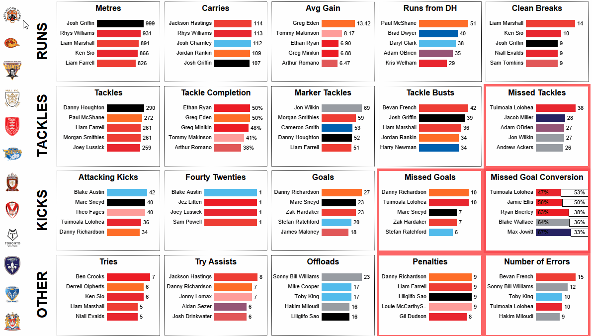 上面是Tableau社区中的一篇展示橄榄球联盟各球队队员在每个位置的排名情况。通过点击对应的队伍Logo起到联动筛选的效果。
