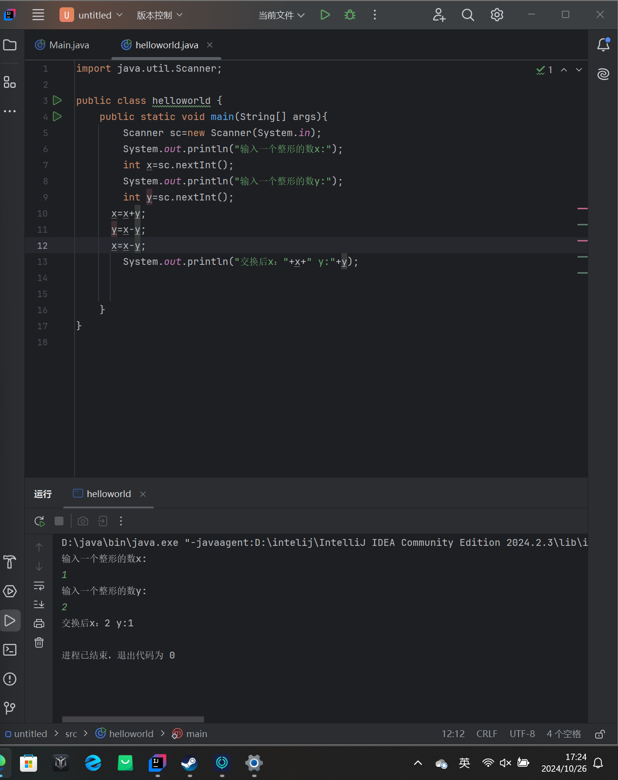 交换两个变量的值,并将交换后的结果打印输出。(不使用第三方变量)