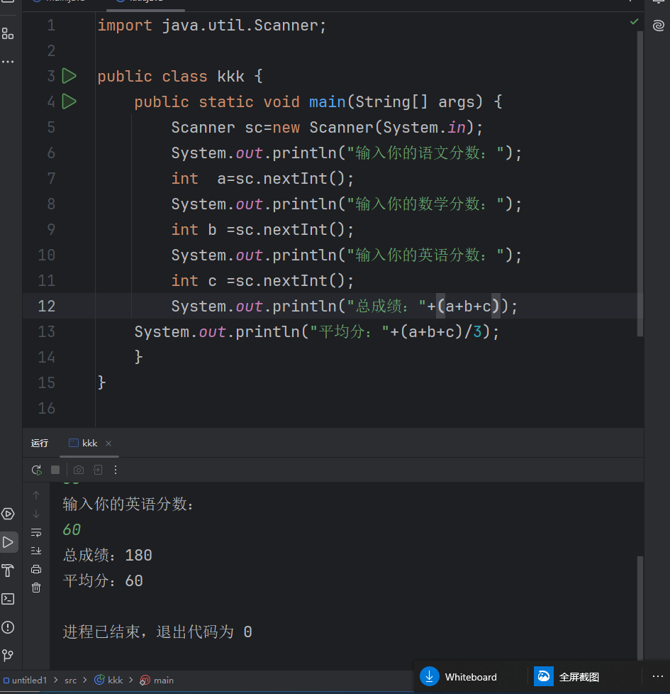 1. (简答题, 5分)编写程序,从键盘输入一个学生语文、数学、英语三门课的成绩,