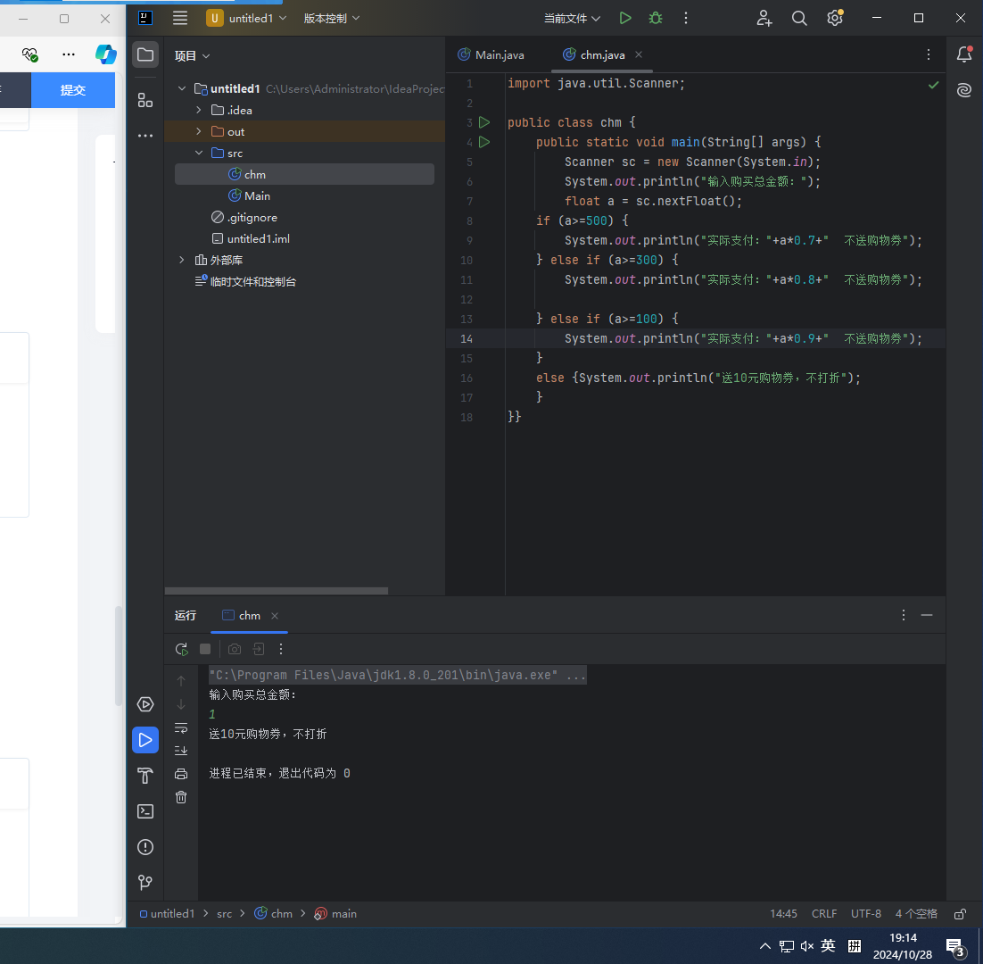 请您编写程序计算用户购买商品实际支付的金额及得到的购物券。