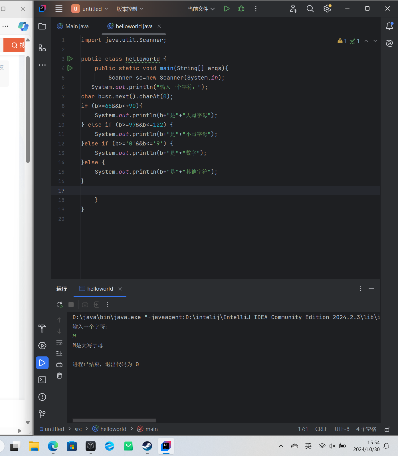 15. (简答题, 10分)编写程序,输入一个字符,判断该字符是数字,是大写字母,还是小写字母,还是其他的字符。