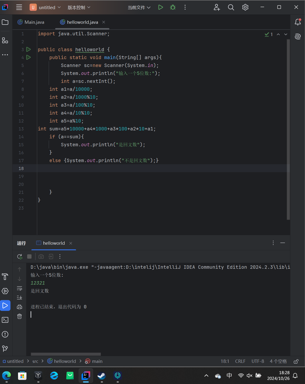 例如:输入:12345,输出:不是回文数。输入:12321,输出:是回文数。