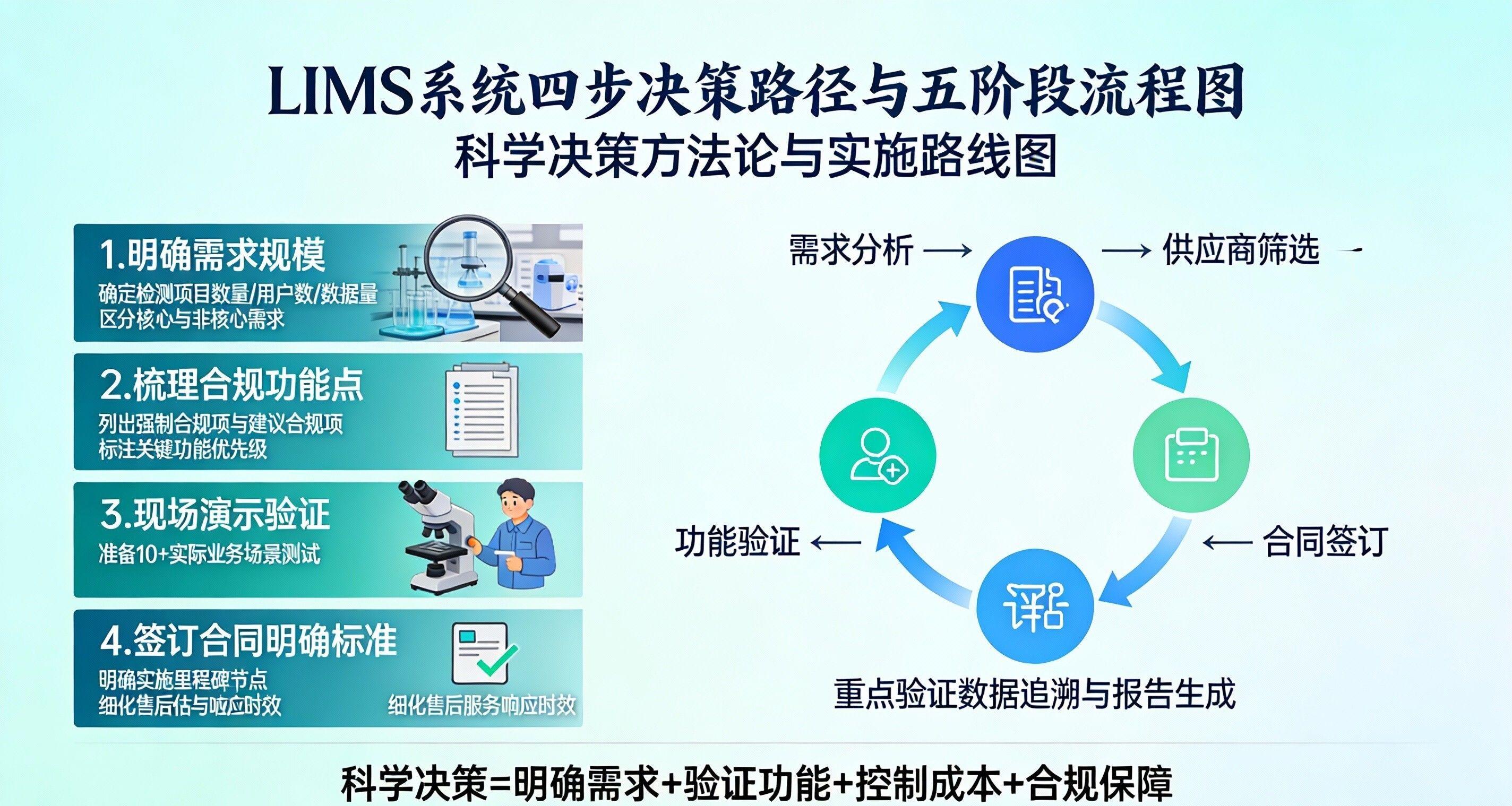 在"双碳"目标和数字化转型的双重驱动下,选择兼具成熟度、合规性与性价比的LIMS系统,已成为环境检测实验室提升核心竞争力的关键。正如某第三方检测机构负责人所言:"LIMS不仅是管理工具,更是我们赢得市场竞争的战略资产。"通过科学选型,实验室能够实现从传统操作向智能管理的质变,为环境保护提供更精准、高效的数据支撑。建议绘制包含需求分析→供应商筛选→功能验证→成本评估→合同签订五个阶段的决策流程图,每个阶段设置明确的通过/不通过指标,如需求分析阶段需完成18项合规功能点