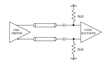 CML 与 LVDS 之间采用交流耦合方式连接(图5)。注意,CML 输出信号摆幅应该在 LVDS 输入能够处理的范围以内。