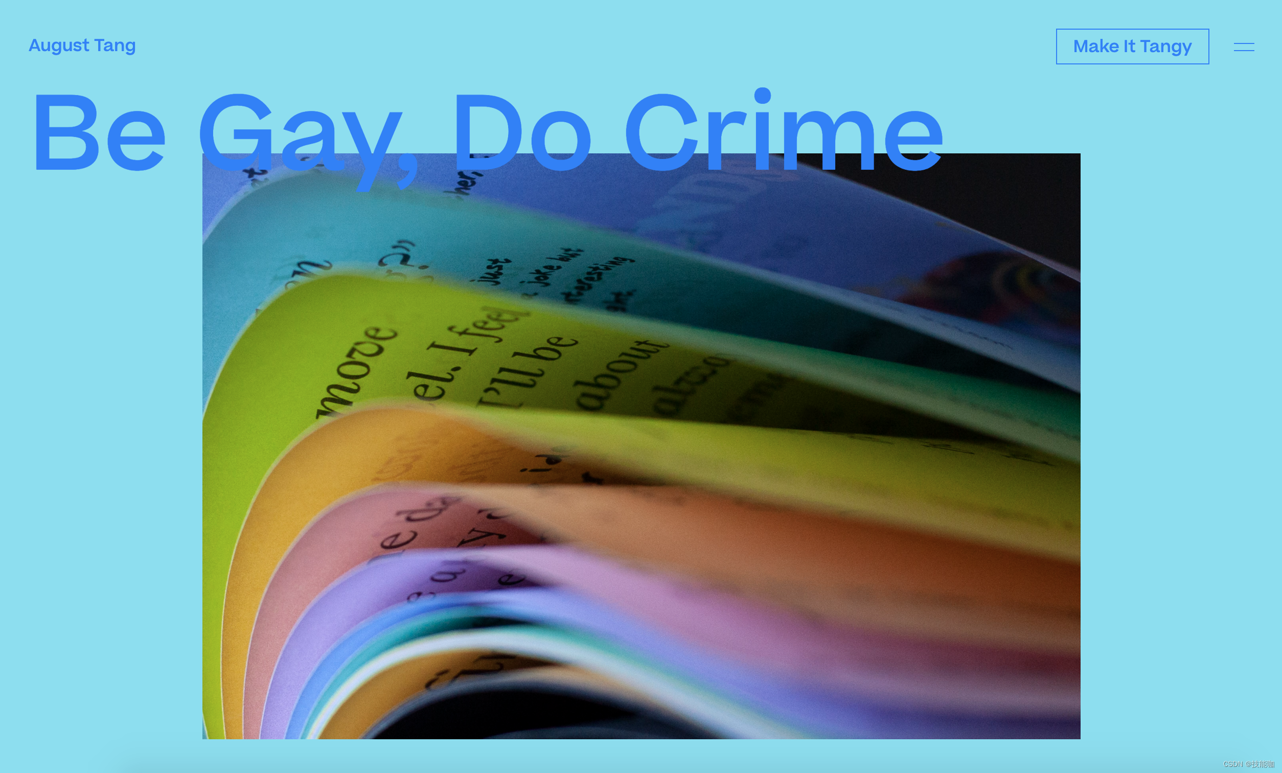 有这种张力,我了解到现代主义是要走的路——极简主义、简洁的线条、简洁的字体,诸如此类——然后另一方面,我喜欢色彩异常丰富的作品——比如,屏幕会灼伤你的眼睛,只是事情真的很响亮和激烈。我想找到一种方法将其与我的作品集与人们互动的方式相结合;用这个“Make It Tangy”按钮改变背景颜色暴露了这个悖论。我选择了一个我真正喜欢并且总是倾向于自然的调色板;它几乎是包豪斯,但不是。我不想让它感觉像原色。我想给他们一个转折点。