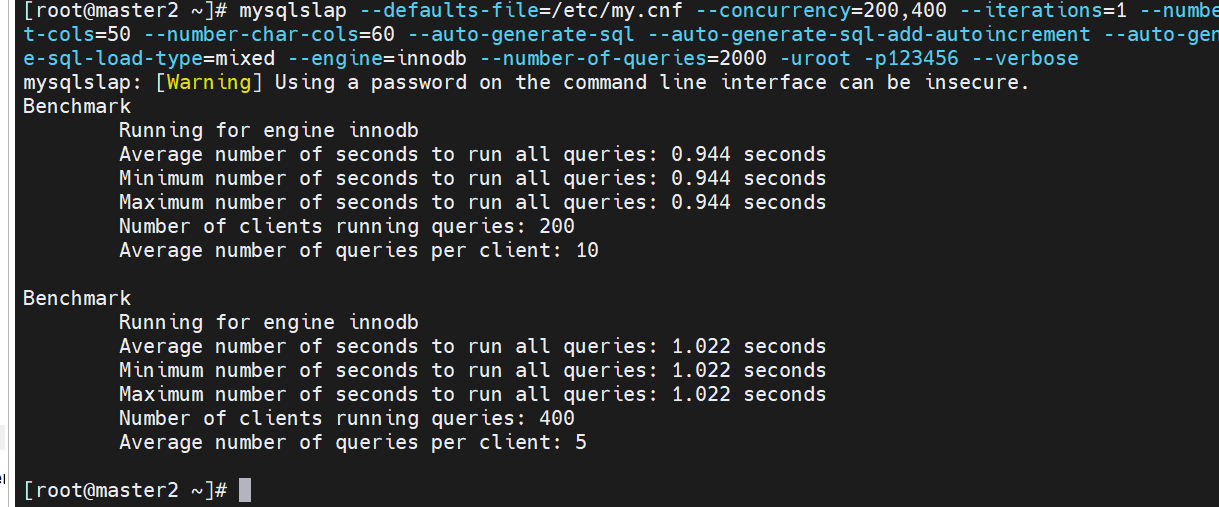 # 修改最大连接数 vim /etc/my.cnf max_connections=1024 systemctl restart mysql # 完成压测,查看仪表盘 mysqlslap --defaults-file=/etc/my.cnf --concurrency=200,400 --iterations=1 --number-int-cols=50 --number-char-cols=60 --auto-generate-sql --auto-generate-sql-add-autoincrement --auto-generate-sql-load-type=mixed --engine=innodb --number-of-queries=2000 -uroot -p123456 --verbose