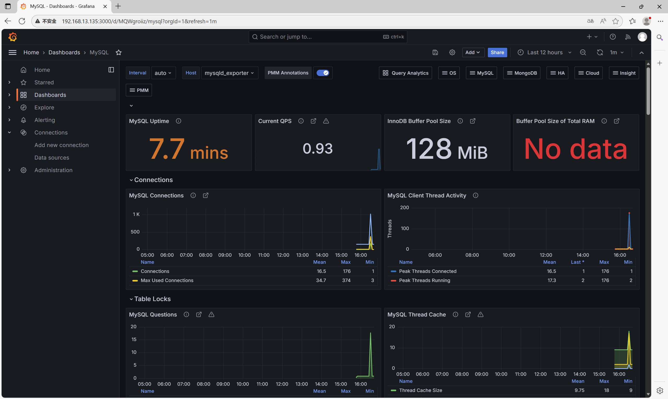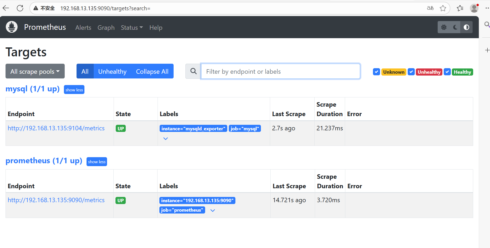 输入http://192.168.13.135:9090 测试是否监控MySql: